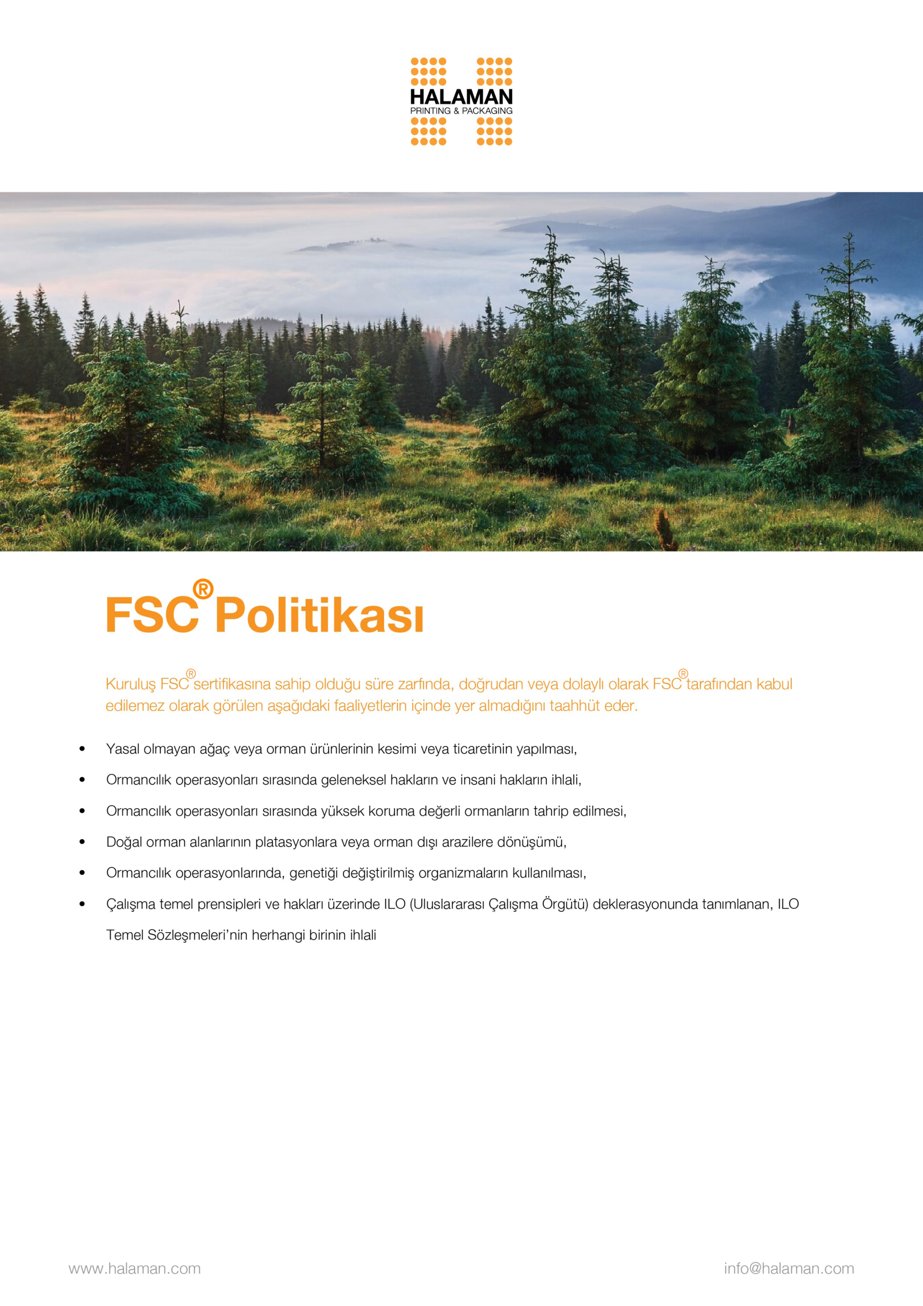 Halaman’da güvenilir tedarik zinciri ve sürdürülebilir üretime kendimizi adadık. FSC® Politikamız ile, güvenilirorman yönetimini destekleyen malzemeler kullanarak gelecek nesiller için daha yeşil bir gezegene katkıda bulunuyoruz.